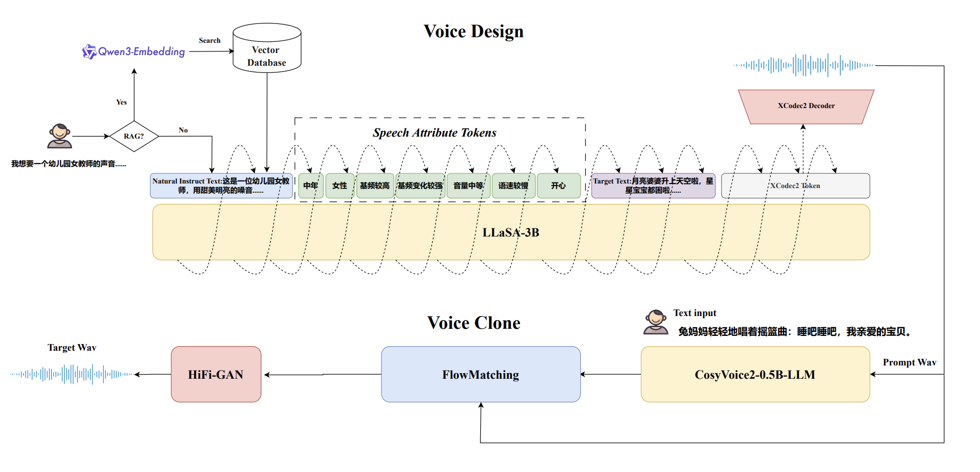 The voice design module enables the generation of timbre from natural language descriptions and supports command refinement through Retrieval-Augmented Generation (RAG). It also provides fine-grained control over voice attributes, including gender, age, speaking rate, fundamental frequency, volume, and emotional expression.